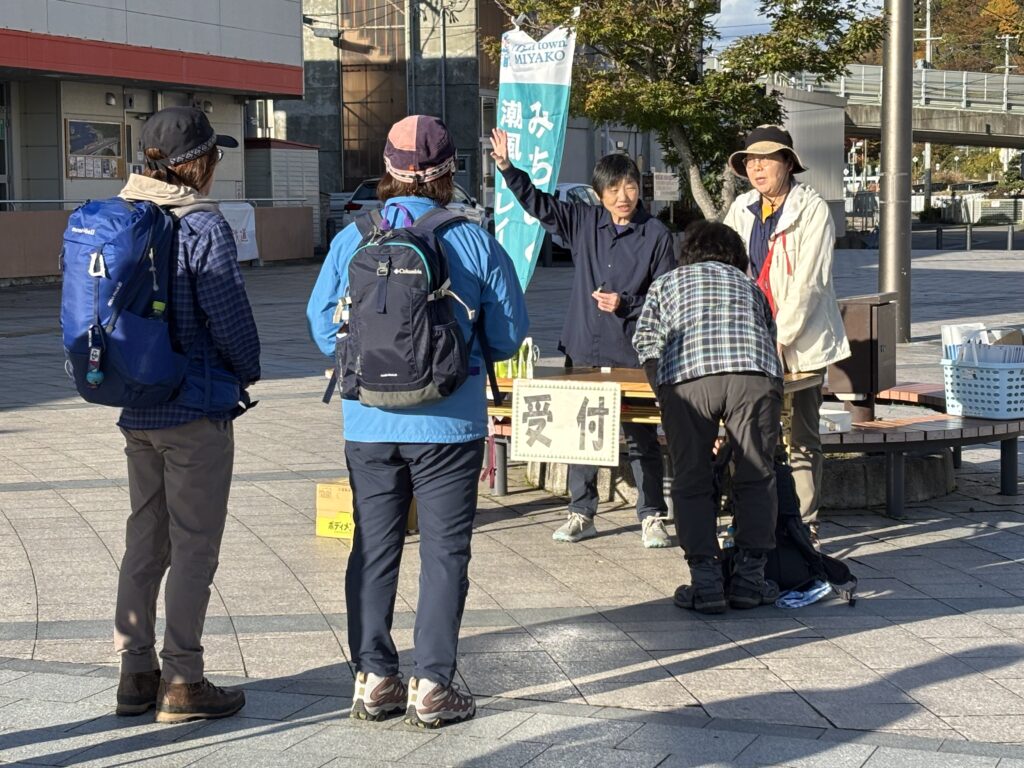 事前に参加応募された参加者の方々が続々と当日の受付を宮古駅前で済ませ、トレイルコースまでのマイクロバスに乗り込み、今回のスタート地点、姉吉漁港付近に移動します。